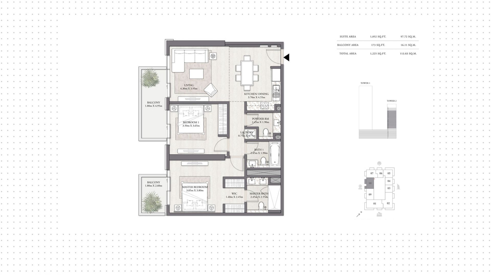 An apartment with 2 bedrooms in the complex Beach Mansion. The apartment with an area of 1 227 ft² is located on the 9 of 45, finished. Windows: panoramic. Delivery of the project is scheduled for the 4st st quarter of 2025.