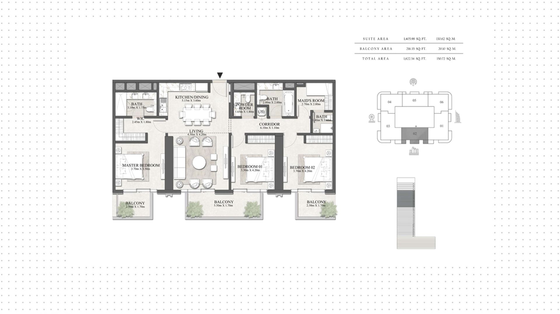 An apartment with 3 bedrooms in the complex Beachgate by Address. The apartment with an area of 1 622 ft² is located on the 32 of 37, finished. Windows: panoramic. Delivery of the project is scheduled for the 4st st quarter of 2026.