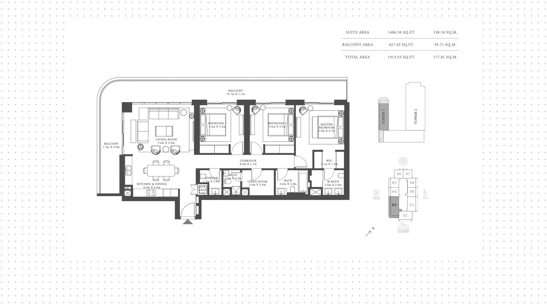 An apartment with 3 bedrooms in the complex Palace Beach Residences. The apartment with an area of 1 914 ft² is located on the 11 of 42, finished. Windows: panoramic. View from the windows: dubai marina view. Delivery of the project is scheduled for the 4st st quarter of 2025.