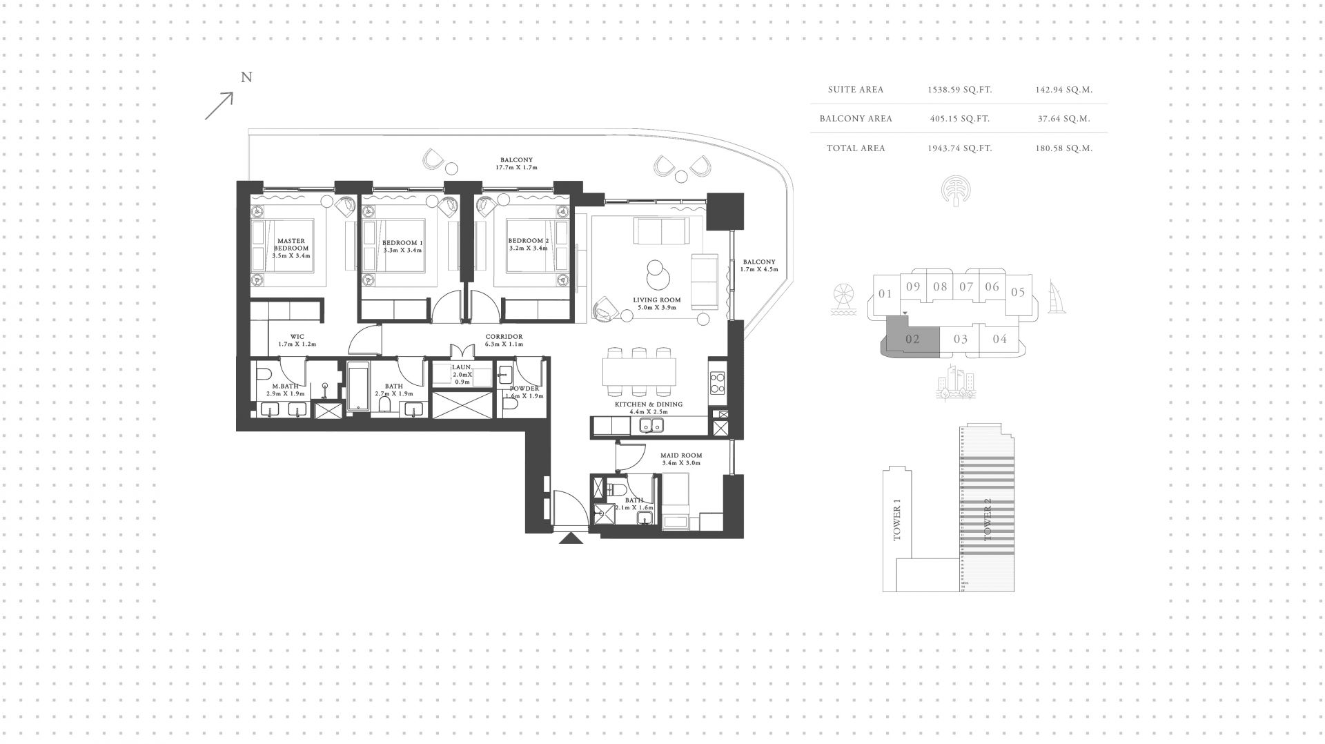 An apartment with 3 bedrooms in the complex Palace Beach Residences. The apartment with an area of 1 914 ft² is located on the of 42, finished. Windows: panoramic. View from the windows: marina view. Delivery of the project is scheduled for the 4st st quarter of 2025.