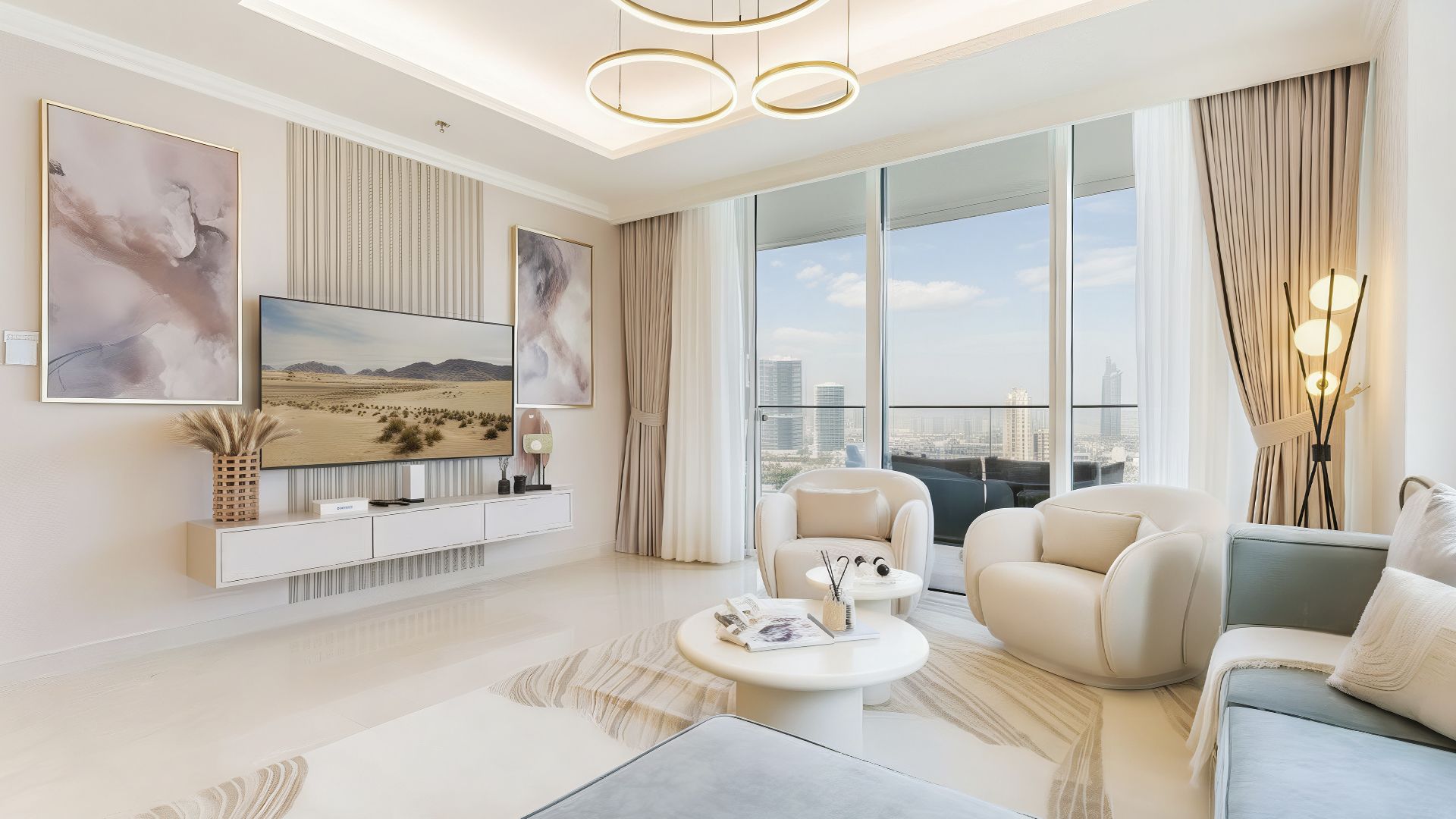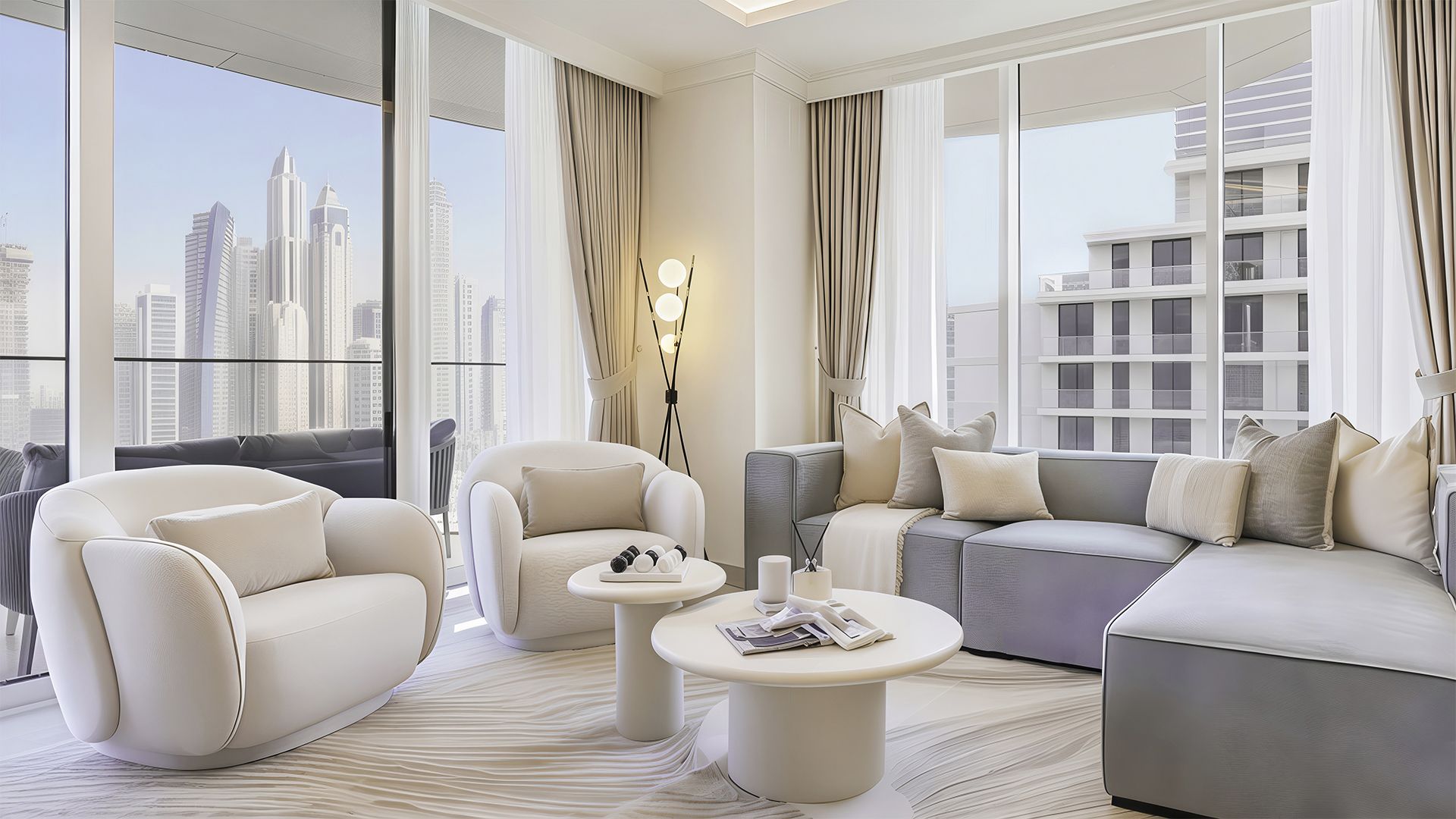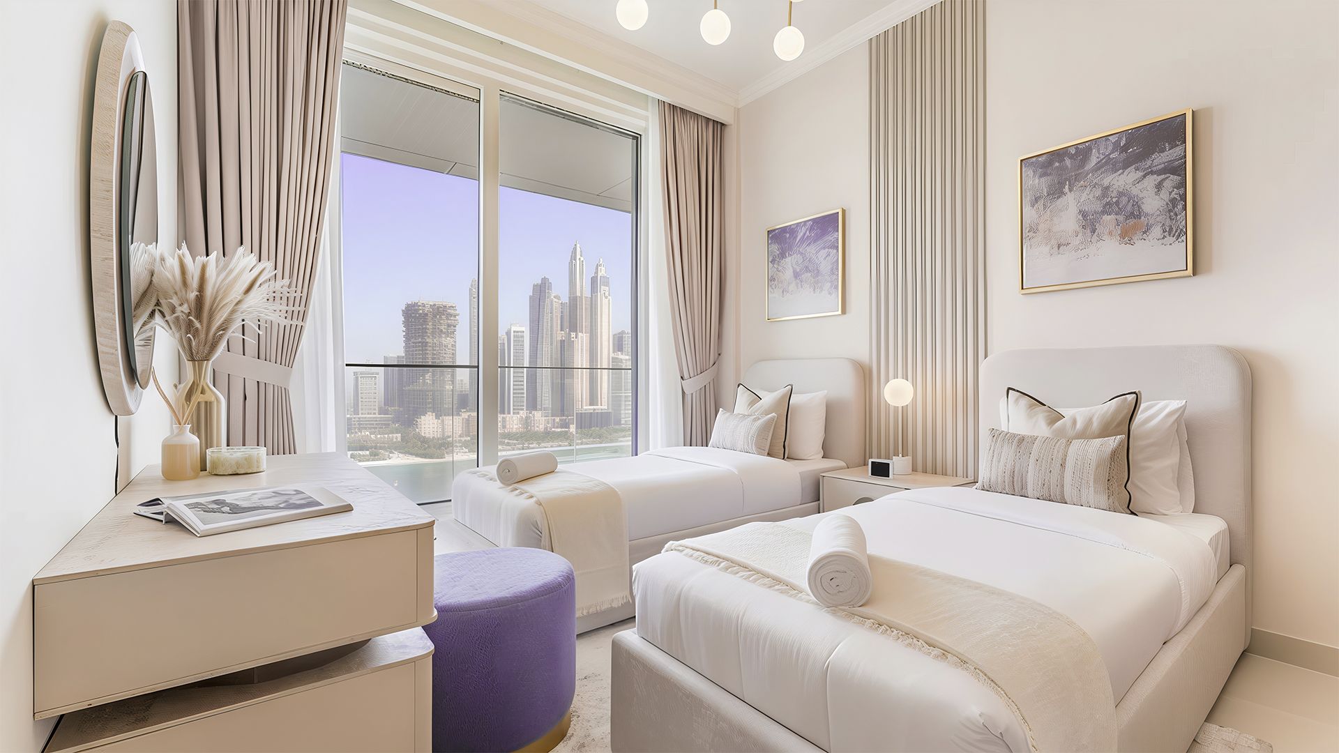 An apartment with 3 bedrooms in the complex Palace Beach Residences. The apartment with an area of 1 800 ft² is located on the 26 of 42, finished. Windows: panoramic. Delivery of the project is scheduled for the 4st st quarter of 2025.