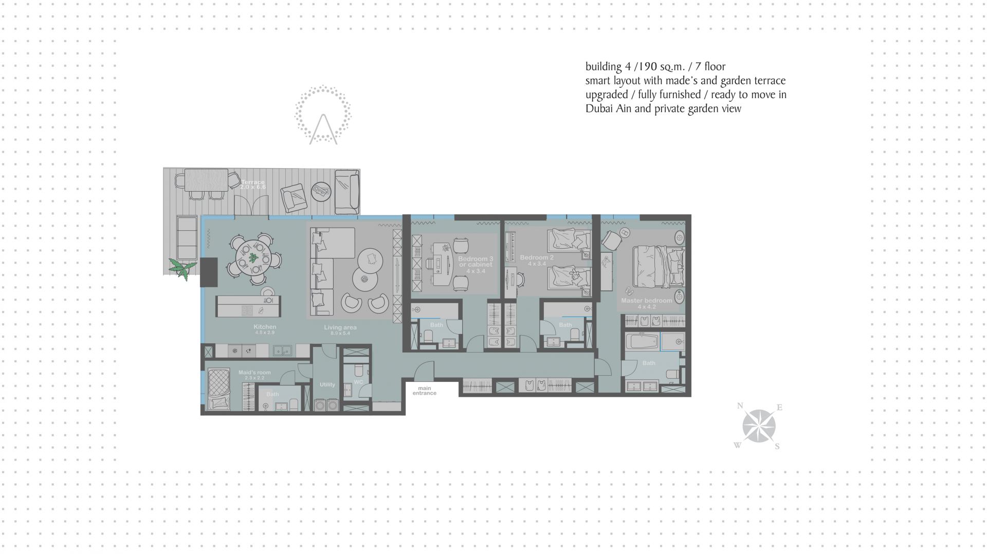 Выйдя на террасу из апартаментов, вы сможете насладиться захватывающими видами на парк, море и колесо обозрения Dubai Ain. Это место станет ваши уютным уголком для теплых посиделок в кругу самых близких. Планировкой предусмотрена большая кухня-гостиная с обеденной зоной, комната для персонала и хозяйственное помещение, а также 3 мастер-спальни, одну из которых можно переоборудовать под домашний кабинет.