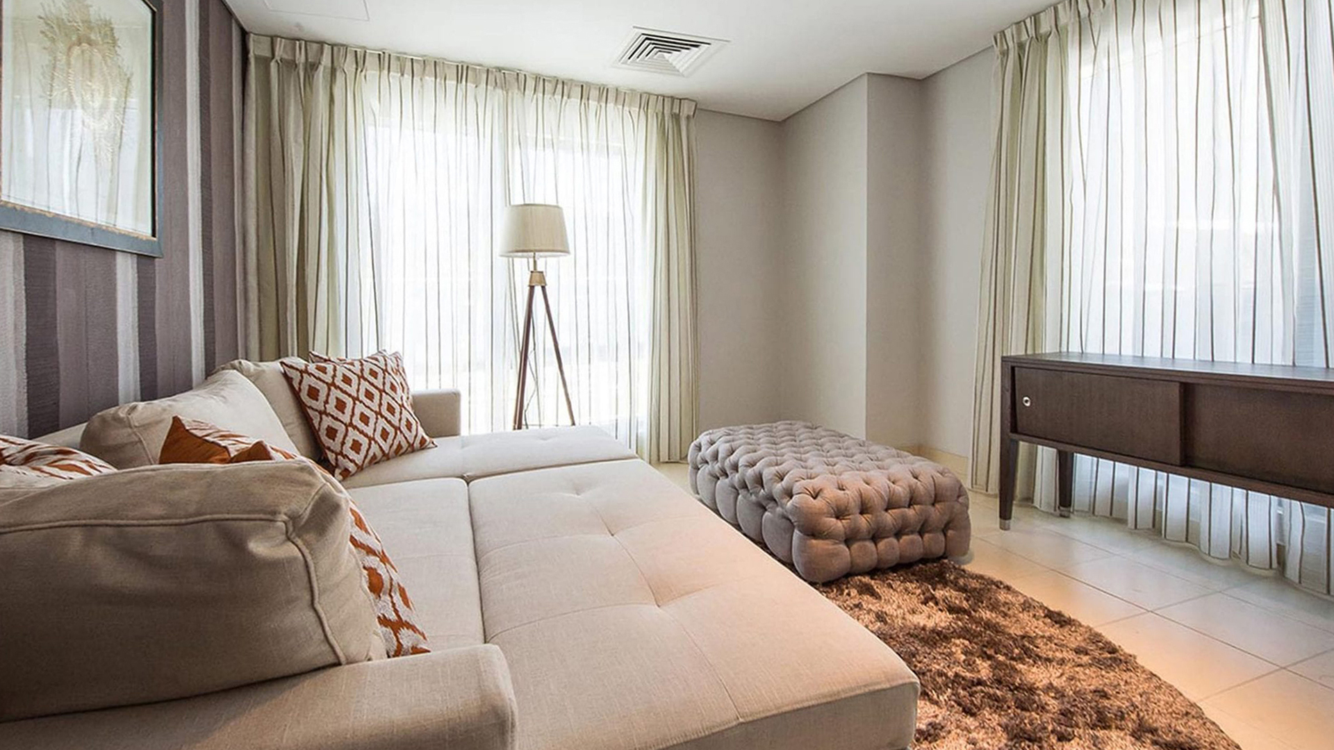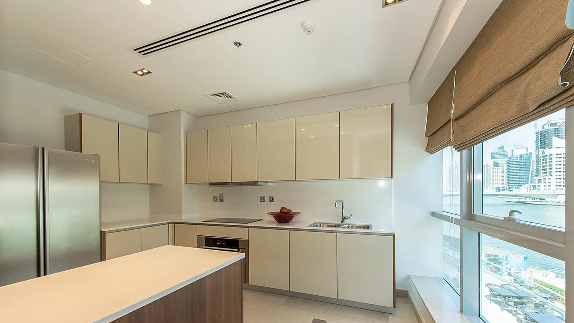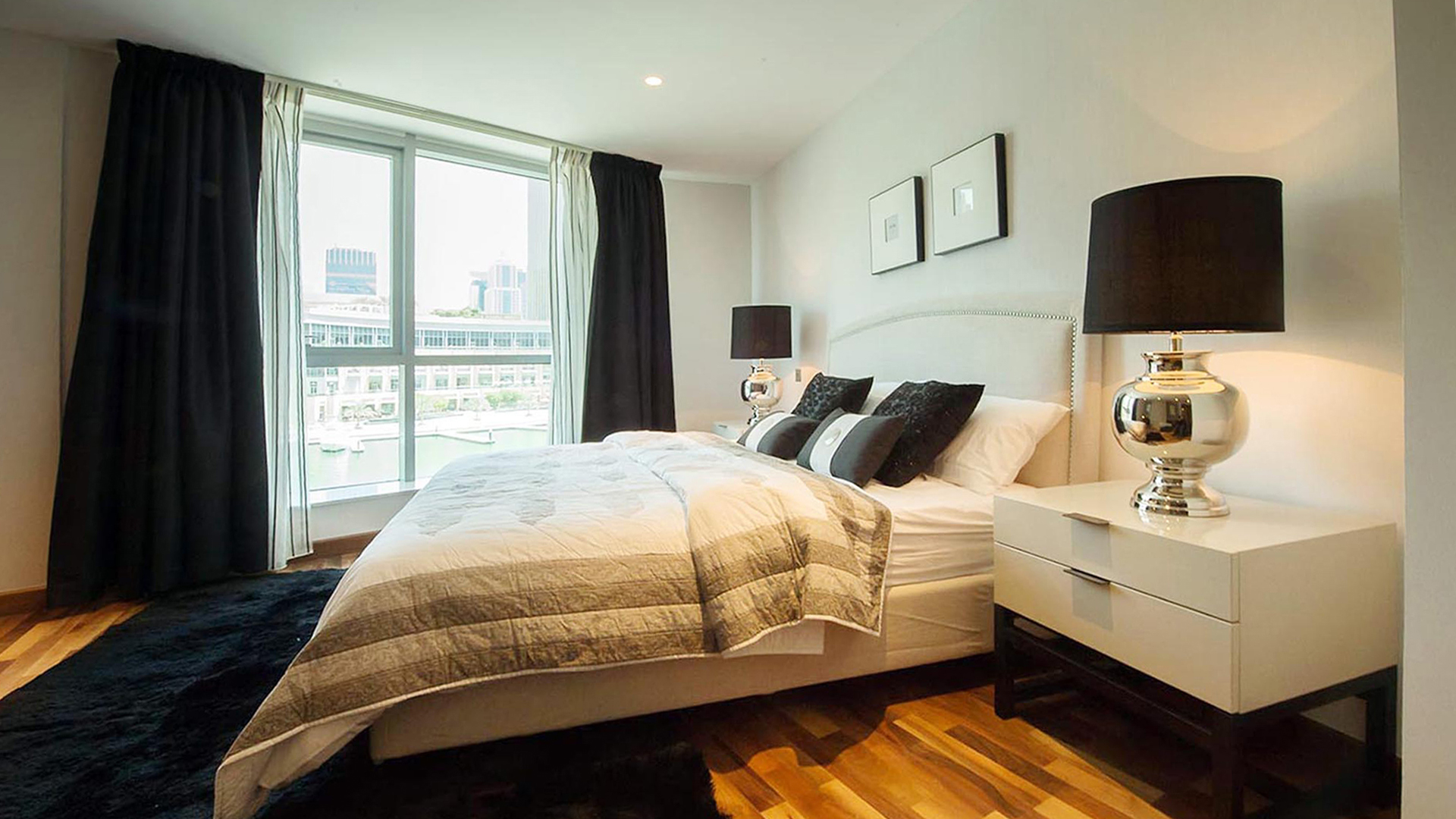 This podium-shared building offers studios, one-, two-, and three-bedroom apartments with neutral palettes, inviting colors, and wooden floors and accents. These units feature modern appliances and fixtures, as well as a balcony with stunning views of the marina.