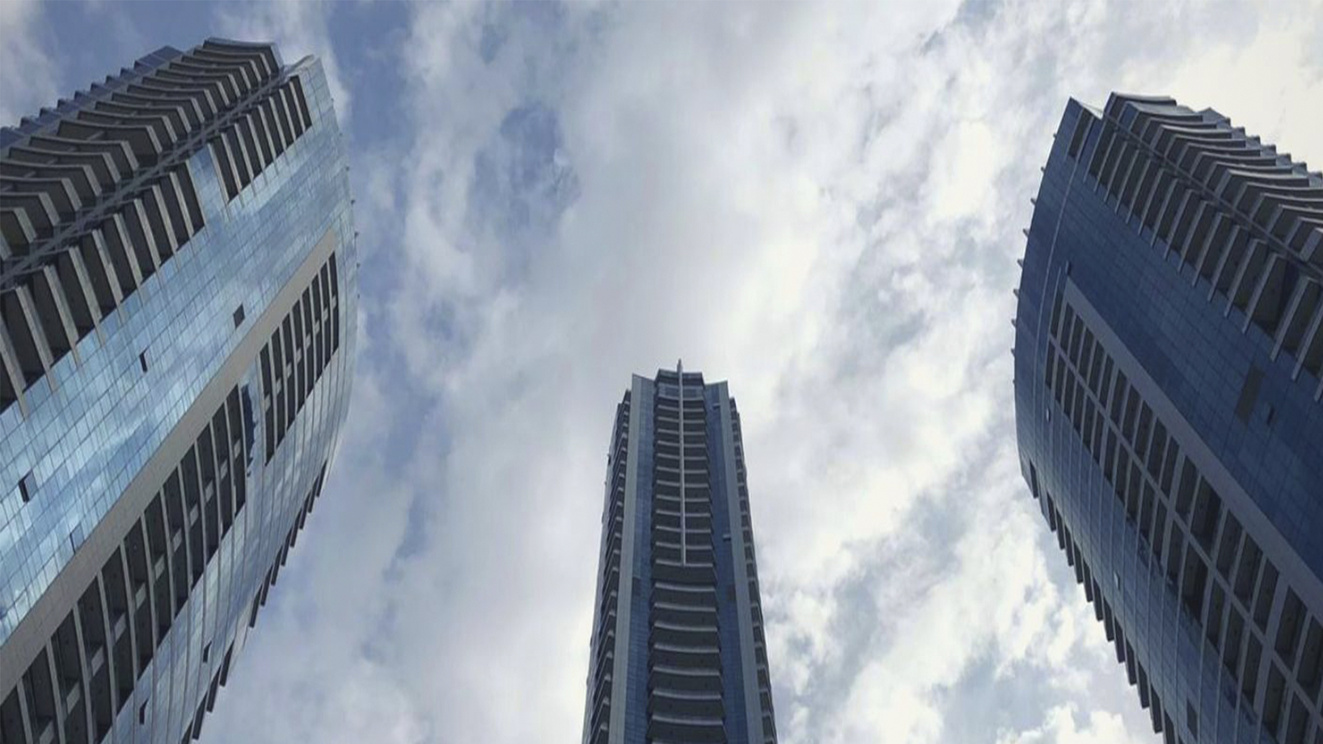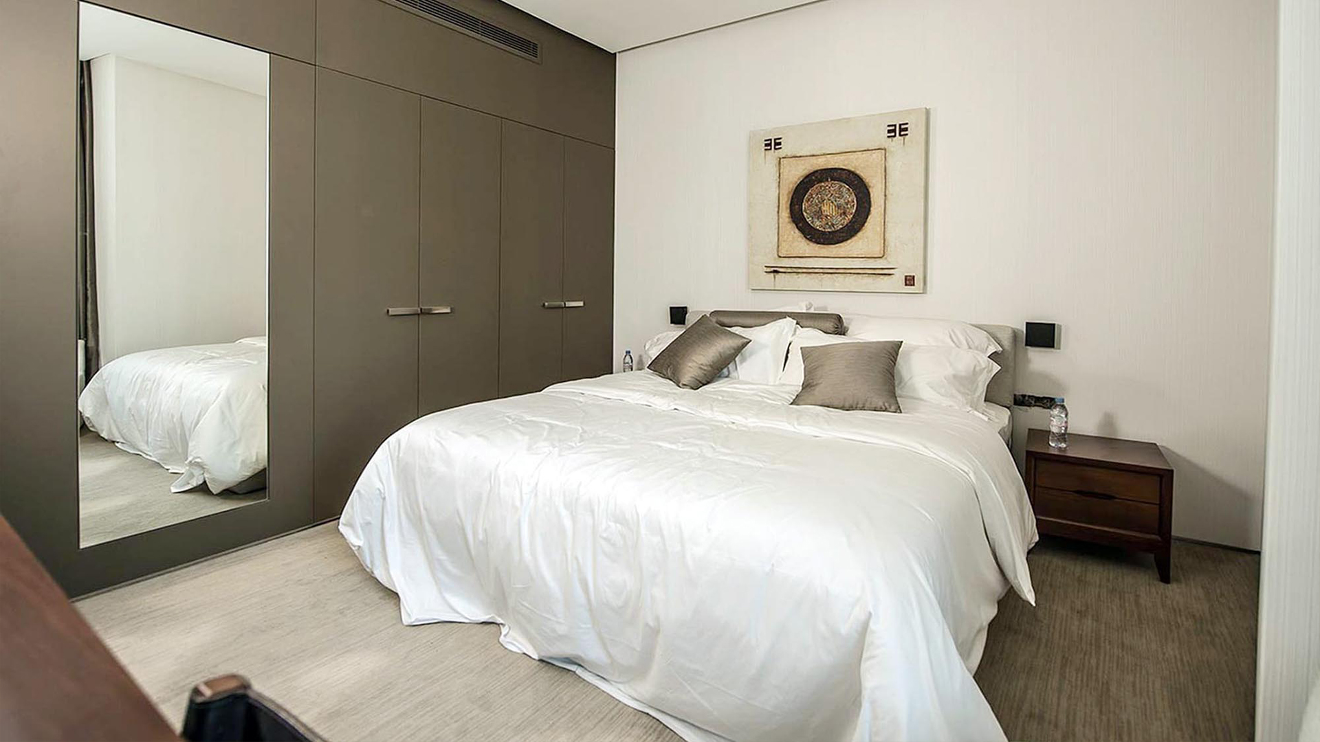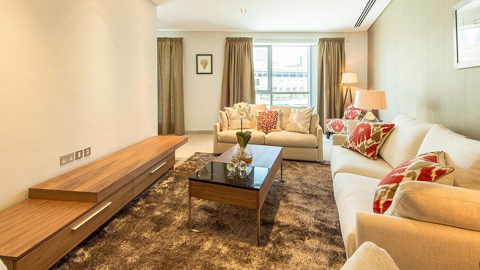 This podium-shared building offers studios, one-, two-, and three-bedroom apartments with neutral palettes, inviting colors, and wooden floors and accents. These units feature modern appliances and fixtures, as well as a balcony with stunning views of the marina.