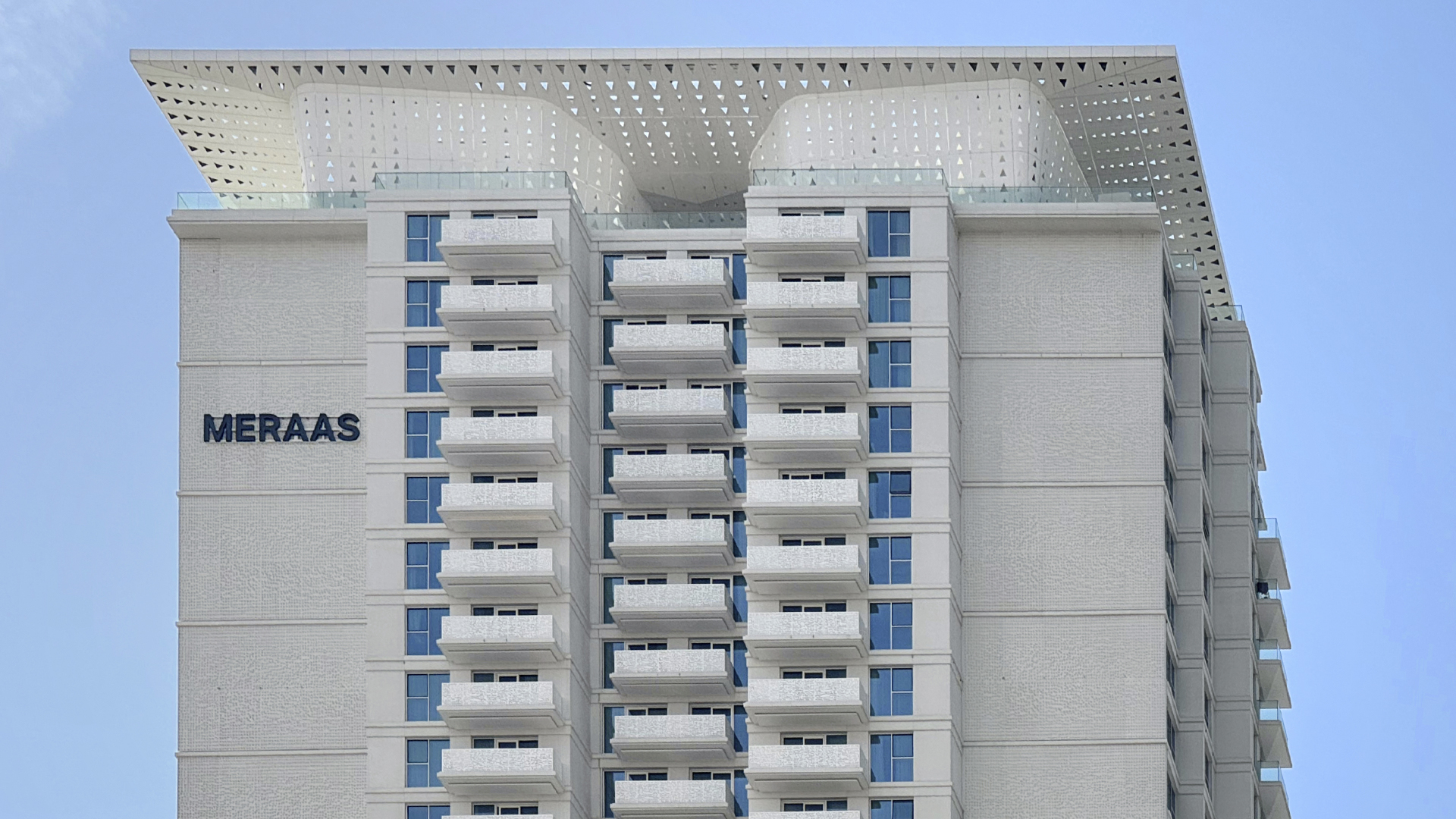 The building provides access to a Private Beach and Panoramic Views of JBR, Palm Jumeirah and The World's Largest Dubai Ain. Inspired by Miami modernist architecture, the facade is decorated with wide glazing and white panels.
